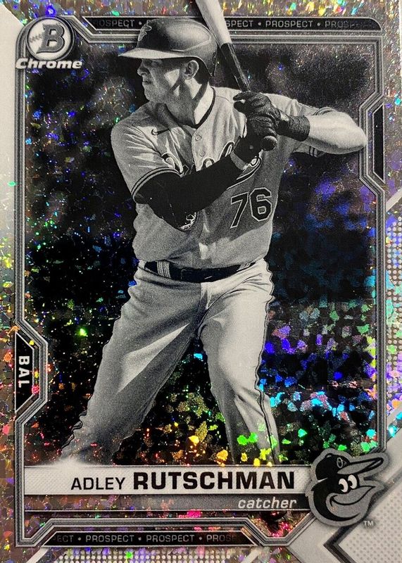 The Adley Rutschman 2021 Bowman Chrome #BCP-241 Prospects - Black & White Mini-Diamond Refractor card in Raw condition has not changed in price in the last 30 days and was last sold for $0.99 .