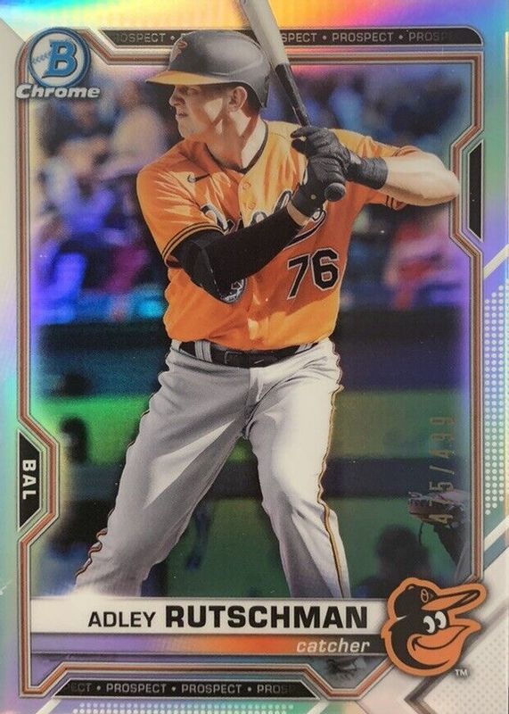 This card is 1 of 22 Adley Rutschman's card variations in the 2021 Bowman Chrome set being tracked by Sports Card Investor, including Prospects, Prospects - Black & White Mini-Diamond Refractor, Prospects - Shimmer Refractor, Prospects - Speckle Refractor /299, and Prospects - Purple Refractor /250.