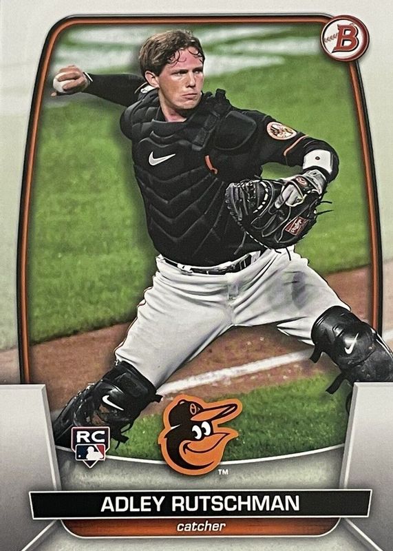 This card is 1 of 3 Adley Rutschman's card variations in the 2023 Bowman set being tracked by Sports Card Investor, including Spotlights, and Rookie of the Year Favorites Autographs /150.