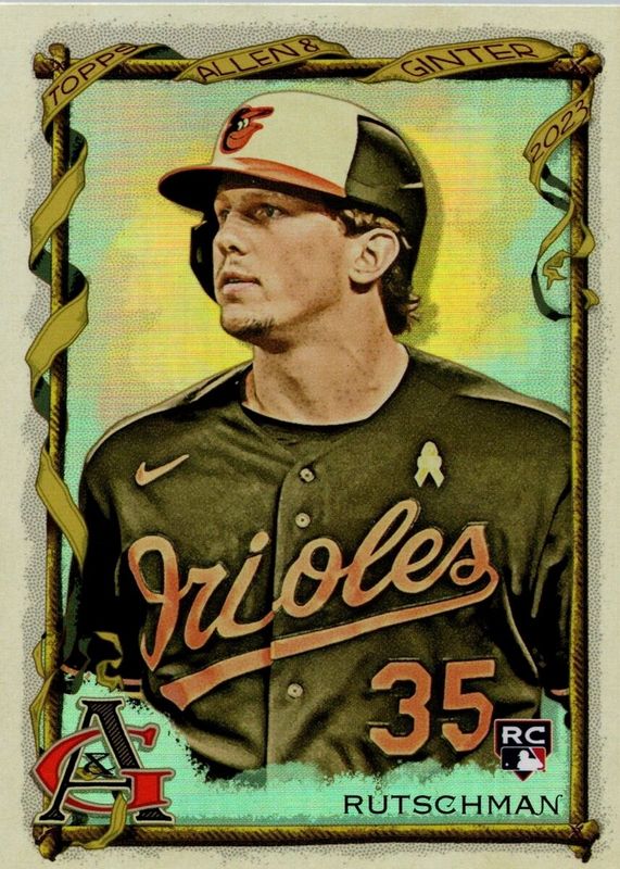 This card is 1 of 8 Adley Rutschman's card variations in the 2023 Topps Allen & Ginter set being tracked by Sports Card Investor, including Base, SP, Foil Filigree, Glossy /1, and Framed Mini Auto.