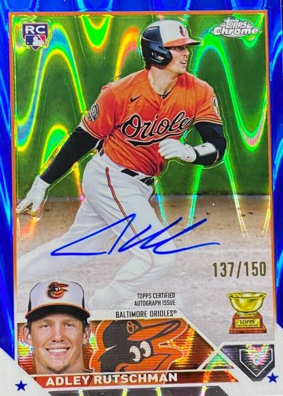 The Adley Rutschman 2023 Topps Chrome #RA-AR Rookie Autographs - Blue RayWave Refractor /150 card in Raw condition has not changed in price in the last 30 days and was last sold for $349.00 .