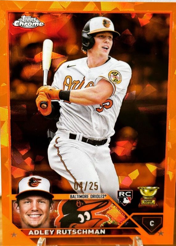 The Adley Rutschman 2023 Topps Chrome Sapphire Edition #250 Orange /25 Rookie card in Raw condition has not changed in price in the last 30 days and was last sold for $107.51 .