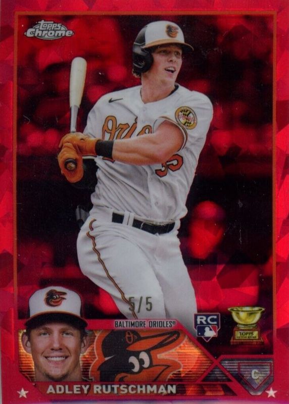 The Adley Rutschman 2023 Topps Chrome Sapphire Edition #250 Red /5 Rookie card in Raw condition has not changed in price in the last 30 days and was last sold for $686.00 .