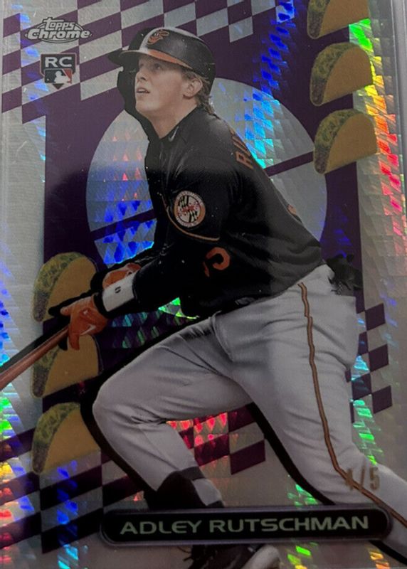 The Adley Rutschman 2023 Topps Chrome #TF-19 TacoFractor /5 Rookie card in Raw condition has not changed in price in the last 30 days and was last sold for $750.00 .