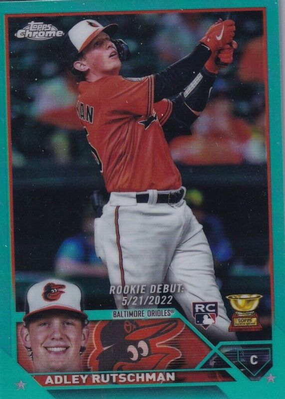 The Adley Rutschman 2023 Topps Chrome Update #USC1 Rookie Debut - Aqua Refractor /199 card in Raw condition has not changed in price in the last 30 days and was last sold for $5.50 .