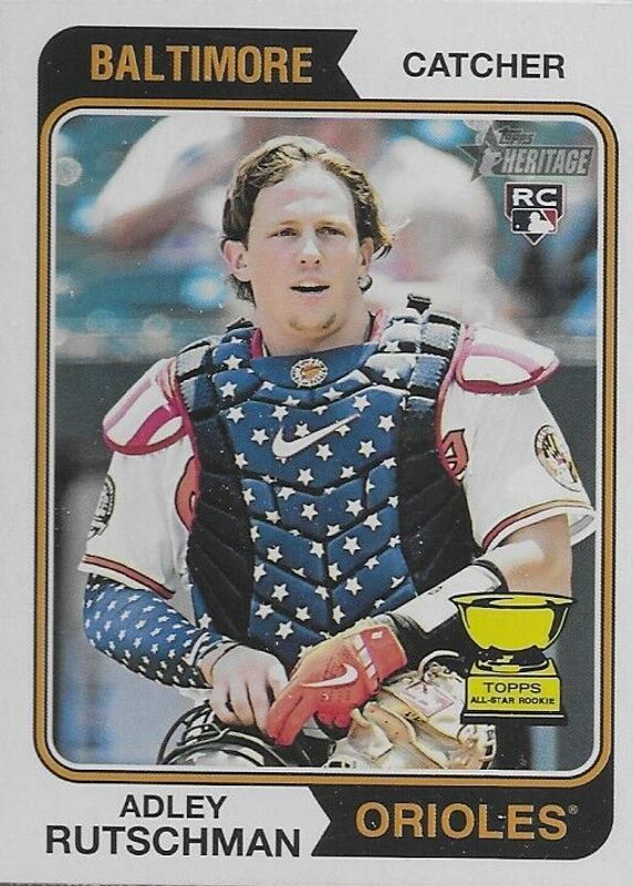 The Adley Rutschman 2023 Topps Heritage #7 Image Variation (Catcher's Gear) Rookie card in Raw condition has not changed in price in the last 30 days and was last sold for $18.99 .