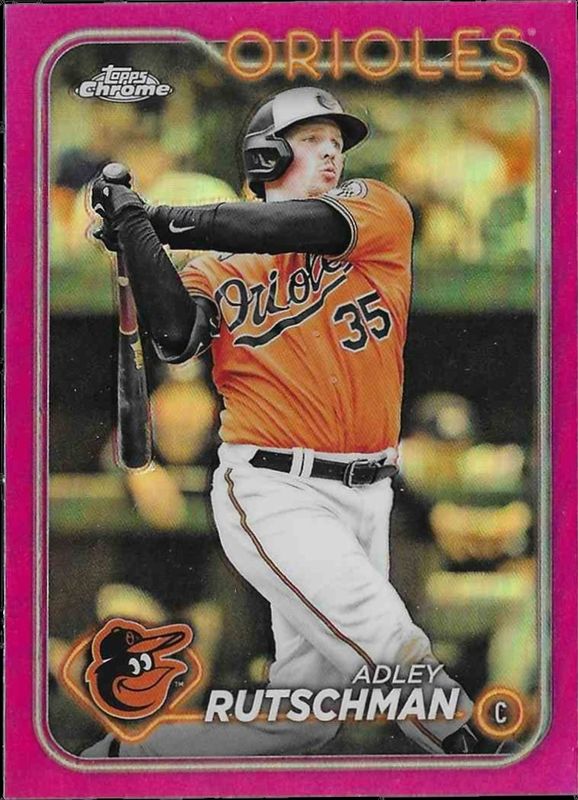 The Adley Rutschman 2024 Topps Chrome #80 Pink Refractor card is 1 of 24 Adley Rutschman's card variations in the 2024 Topps Chrome set being tracked by Sports Card Investor, including Base, X Fractor, Aqua Lava Refractor /199, Aqua RayWave Refractor /199, and Aqua Refractor /199.