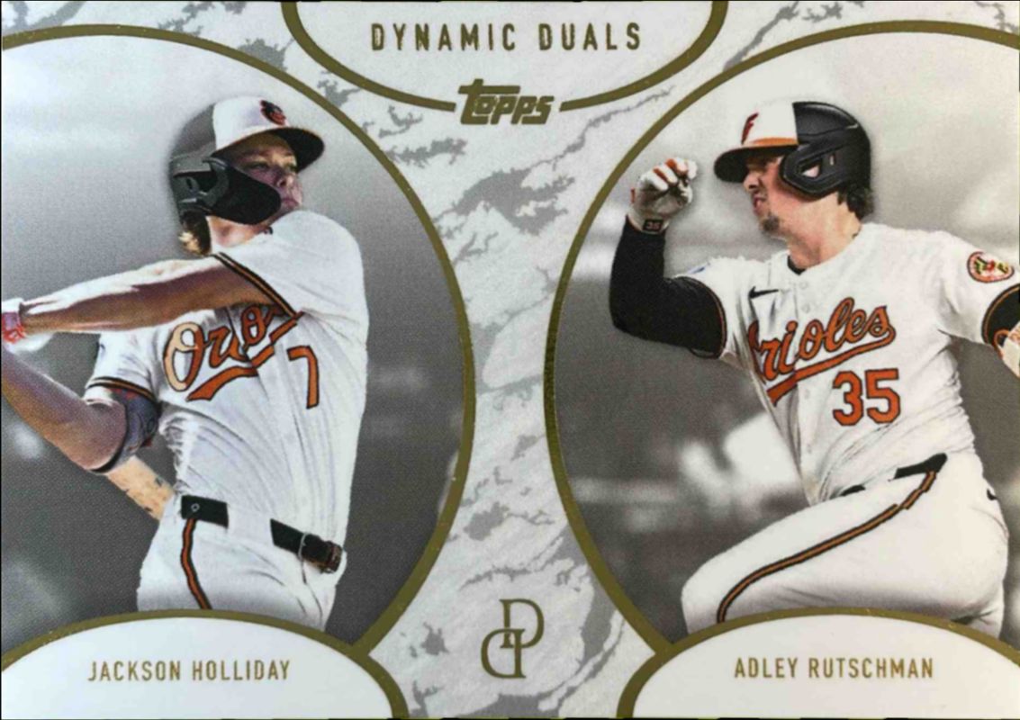 The Adley Rutschman / Jackson Holliday 2025 Topps Dynamic Duals #6 Base card is 1 of 15 Adley Rutschman / Jackson Holliday's card variations in the 2025 Topps Dynamic Duals set being tracked by Sports Card Investor, including Purple /99, Black /50, Blue /25, Red /10, and Orange /5.
