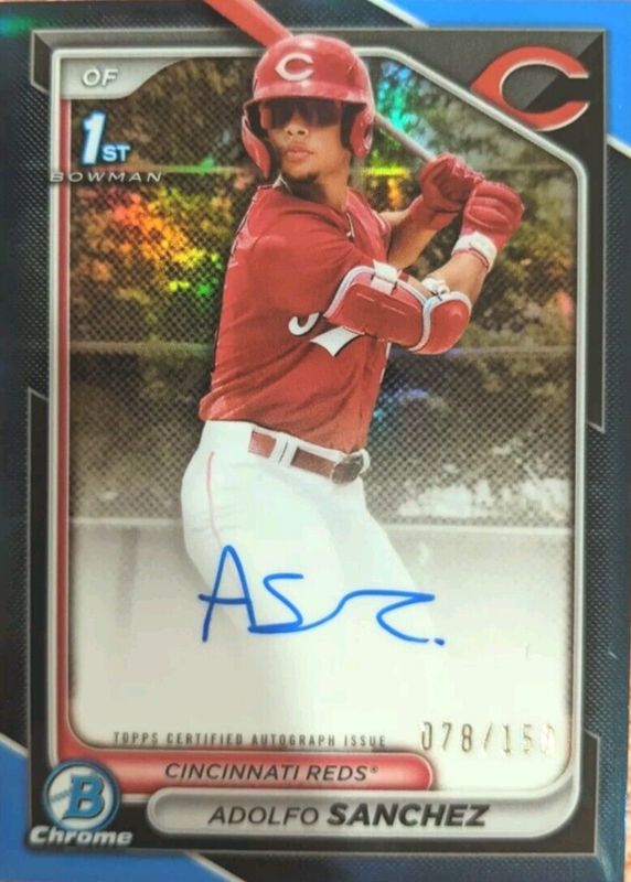 The Adolfo Sanchez 2024 Bowman Chrome #CPA-AS Prospect Auto - Blue Refractor /150 (1st) card in Raw condition has not changed in price in the last 30 days and was last sold for $23.97 .