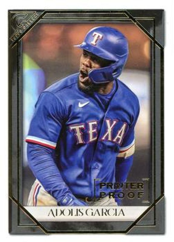 The Adolis Garcia 2021 Topps Gallery #110 Printer Proof card is 1 of 21 Adolis Garcia's card variations in the 2021 Topps Gallery set being tracked by Sports Card Investor, including Base, Rainbow Foil, Private Issue /250, Green /125, and Green Pattern /99.