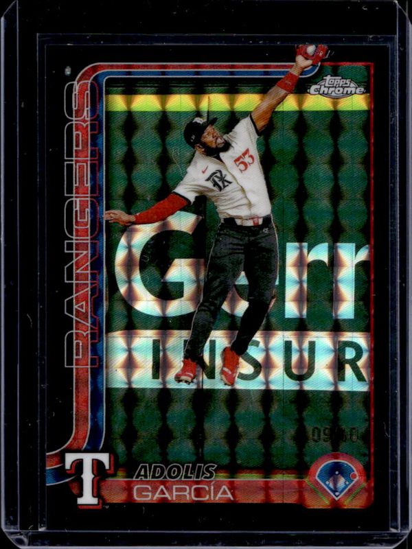 The Adolis Garcia 2025 Topps Chrome #293 Black Geometric Refractor /10 card is 1 of 73 Adolis Garcia's card variations in the 2025 Topps Chrome set being tracked by Sports Card Investor, including Base, Geometric Refractor, Image Variation, Lightboard Logo Variation, and Negative Refractor.