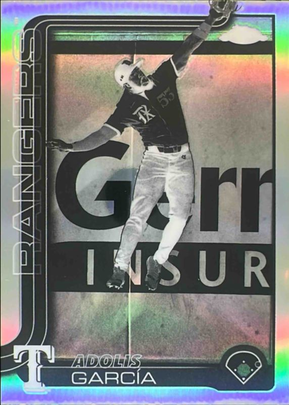The Adolis Garcia 2025 Topps Chrome #293 Negative Refractor card is 1 of 73 Adolis Garcia's card variations in the 2025 Topps Chrome set being tracked by Sports Card Investor, including Base, Geometric Refractor, Image Variation, Lightboard Logo Variation, and Prism Refractor.