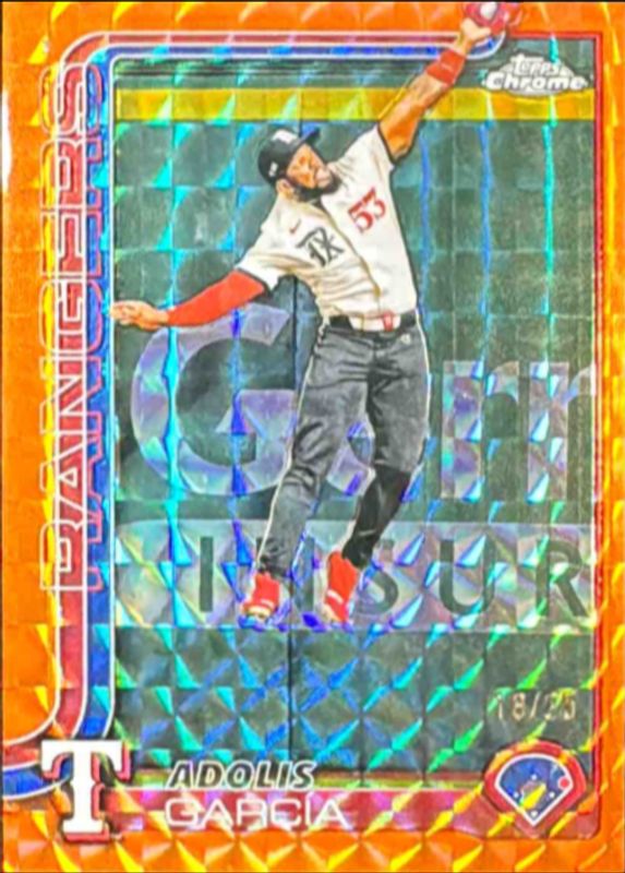 The Adolis Garcia 2025 Topps Chrome #293 Orange Geometric Refractor /25 card is 1 of 73 Adolis Garcia's card variations in the 2025 Topps Chrome set being tracked by Sports Card Investor, including Base, Geometric Refractor, Image Variation, Lightboard Logo Variation, and Negative Refractor.