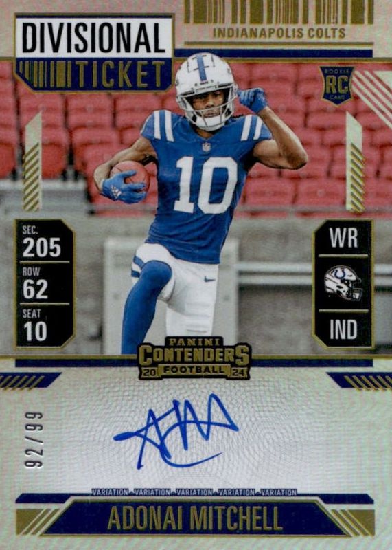 The Adonai Mitchell 2024 Contenders #108 Rookie Ticket Auto Variation - Divisional Ticket /99 card in Raw condition has not changed in price in the last 30 days and was last sold for $7.50 .