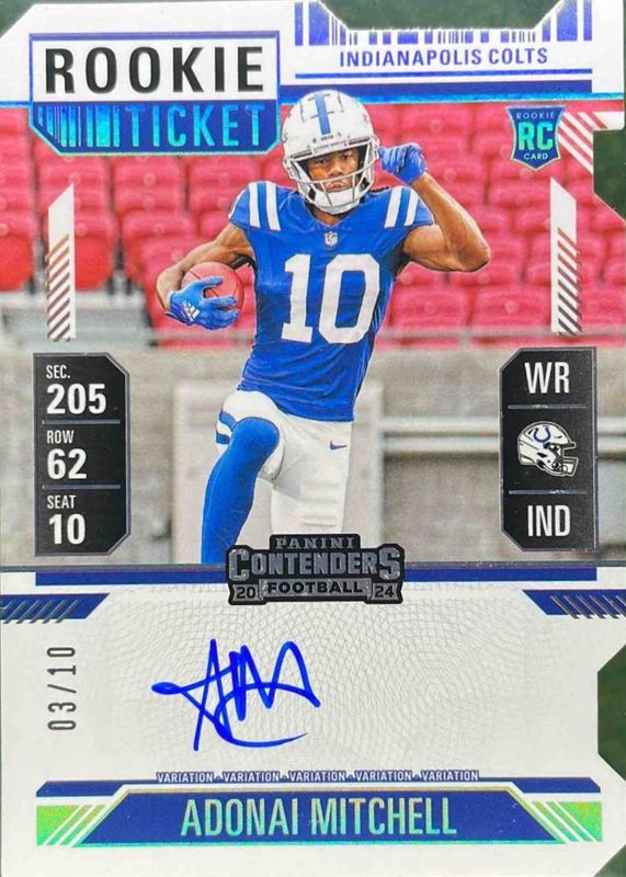 This card is 1 of 27 Adonai Mitchell's card variations in the 2024 Contenders set being tracked by Sports Card Investor, including Rookie Ticket Auto, Rookie Ticket Auto - Opening Kickoff Ticket, Rookie Ticket Auto - Red Zone Ticket, Rookie Ticket Auto - Ticket Stub (/10), and Rookie Ticket Auto Variation.