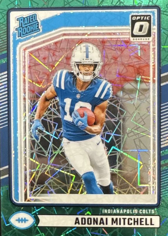 The Adonai Mitchell 2024 Donruss #343 Optic Preview - Green Velocity Rookie card in Raw condition has not changed in price in the last 30 days and was last sold for $0.99 .