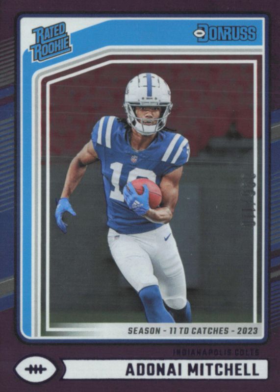 The Adonai Mitchell 2024 Donruss #343 Season Stat Line (/110) Rookie card in Raw condition has not changed in price in the last 30 days and was last sold for $2.25 .