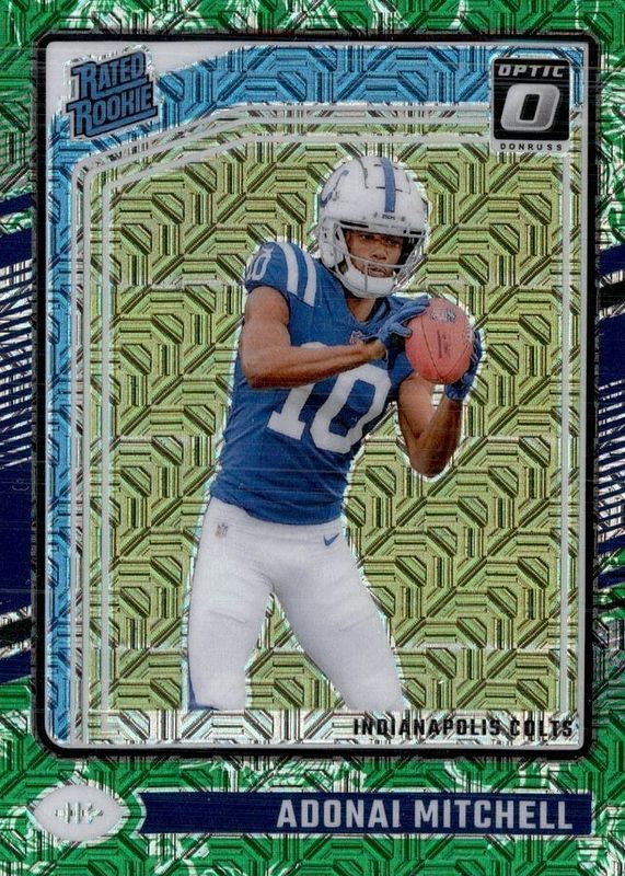 This card is 1 of 63 Adonai Mitchell's card variations in the 2024 Optic set being tracked by Sports Card Investor, including Base, Blue Hyper, Blue Scope, Green Hyper, and Green Velocity.