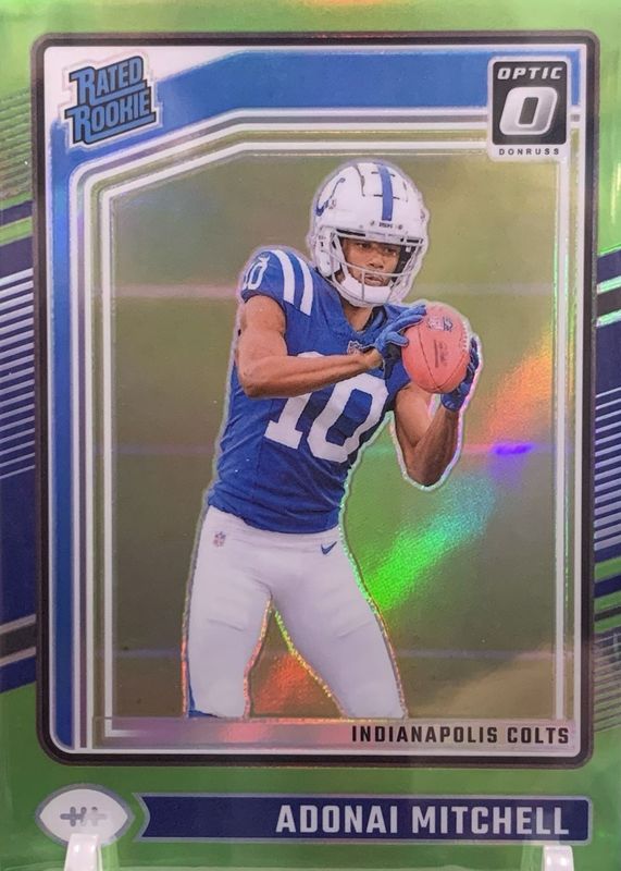 The Adonai Mitchell 2024 Optic #203 Lime Green /50 Rookie card in Raw condition has not changed in price in the last 30 days and was last sold for $25.00 .