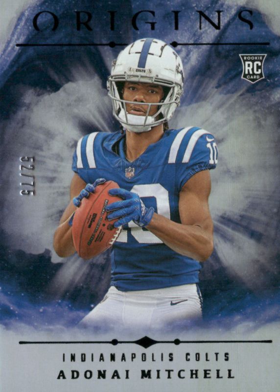 This card is 1 of 21 Adonai Mitchell's card variations in the 2024 Origins set being tracked by Sports Card Investor, including Base, Holo Red /299, Holo Orange /149, Red /149, and Orange /125.