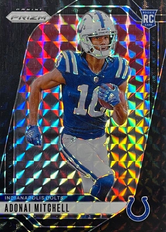 This card is 1 of 121 Adonai Mitchell's card variations in the 2024 Prizm set being tracked by Sports Card Investor, including Base, Choice Blue Yellow Green, Choice Silver, Disco, and Green.