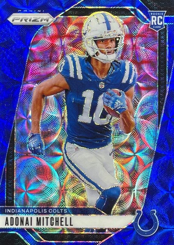This card is 1 of 121 Adonai Mitchell's card variations in the 2024 Prizm set being tracked by Sports Card Investor, including Base, Choice Blue Yellow Green, Choice Silver, Disco, and Green.
