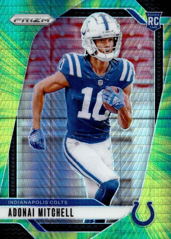 This card is 1 of 121 Adonai Mitchell's card variations in the 2024 Prizm set being tracked by Sports Card Investor, including Base, Choice Blue Yellow Green, Choice Silver, Disco, and Green.