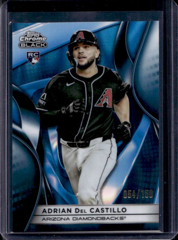 The Adrian Del Castillo 2025 Topps Chrome Black #122 Blue Refractor /150 Rookie card is 1 of 17 Adrian Del Castillo's card variations in the 2025 Topps Chrome Black set being tracked by Sports Card Investor, including Base, Refractor /199, Blue Lava Refractor /150, Green Refractor /99, and Green Wave Refractor /99.