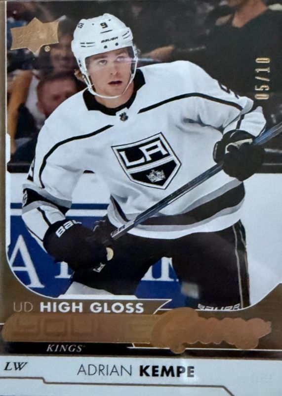 Adrian Kempe's Hockey cards are available in at least 64 sets. Adrian Kempe's biggest 7-day price movers are 2017 Upper Deck #210 Young Guns - UD High Gloss /10, 2022 SP Game Used #BYAS-AK 2022 NHL All Star Game Banner Year Relics, and 2022 SP Game Used #AS-38 2022 NHL All Star Game Jersey.