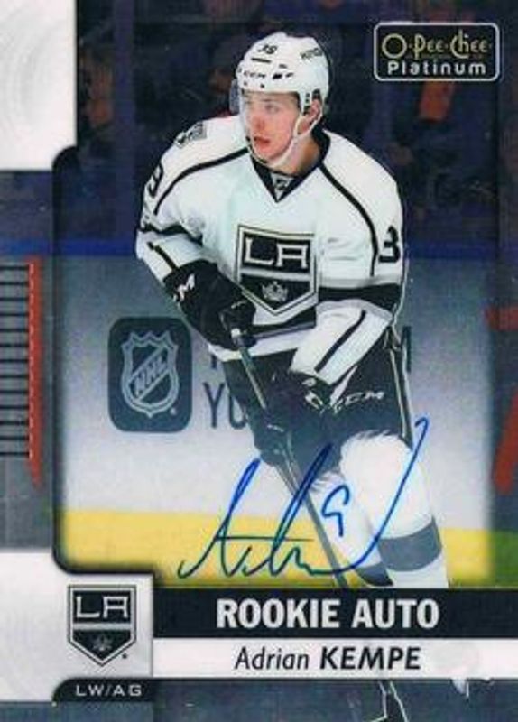 The Adrian Kempe 2017 O-Pee-Chee Platinum #R-AK Rookie Autographs card is 1 of 28 Adrian Kempe's card variations in the 2017 O-Pee-Chee Platinum set being tracked by Sports Card Investor, including Base, Rainbow, Violet Pixels, Red Prism /199, and Royal Blue Cubes /99.