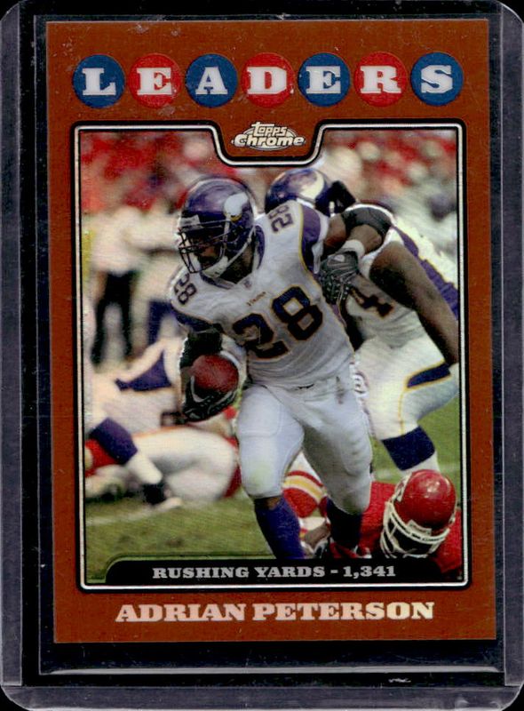 The Adrian Peterson 2008 Topps Chrome #TC125 Copper Refractor /425 card is 1 of 48 Adrian Peterson's card variations in the 2008 Topps Chrome set being tracked by Sports Card Investor, including #TC125 Base, #TC133 Base, #TC164 Base, #TC39 Base, and #TC39 Printing Plates Black /1.