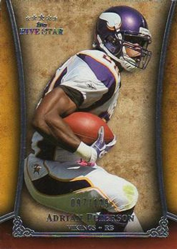 The Adrian Peterson 2011 Topps Five Star #60 Base /129 card is 1 of 3 Adrian Peterson's card variations in the 2011 Topps Five Star set being tracked by Sports Card Investor, including Patches /40, and Letter Patch /6.