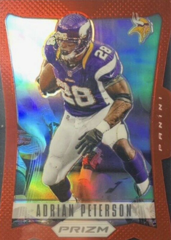 This card is 1 of 5 Adrian Peterson's card variations in the 2012 Prizm set being tracked by Sports Card Investor, including Base, Green, Silver, and Gold /10.