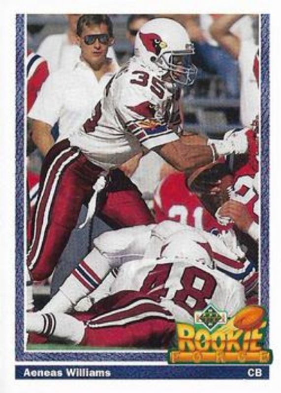 The Aeneas Williams 1991 Upper Deck #630 Base Rookie card is 1 of 2 Aeneas Williams' card variations in the 1991 Upper Deck set being tracked by Sports Card Investor, including Rookie Force.