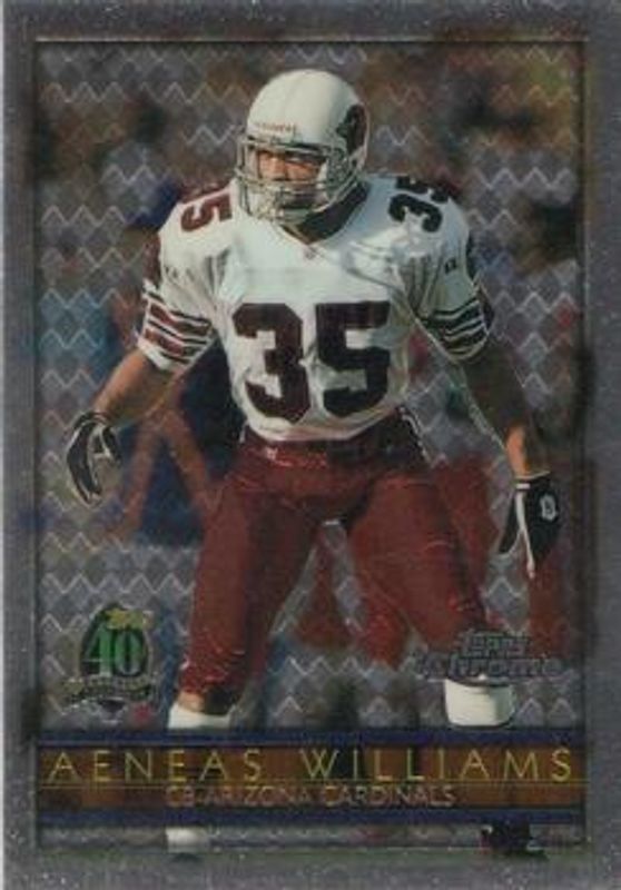 The Aeneas Williams 1996 Topps Chrome #37 Base card is 1 of 2 Aeneas Williams' card variations in the 1996 Topps Chrome set being tracked by Sports Card Investor, including Refractor.