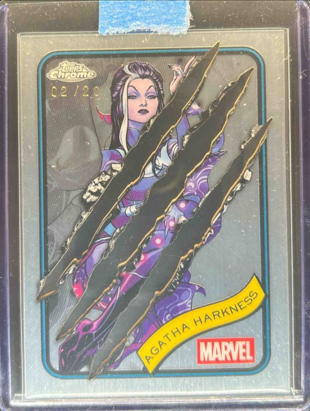 The Agatha Harkness 2025 Topps Chrome #6 Clawed Chrome Refractor /20 card is 1 of 23 Agatha Harkness' card variations in the 2025 Topps Chrome set being tracked by Sports Card Investor, including Base, Refractor, Yellow Lava Refractor, Spider Web Refractor /399, and Blue Refractor /299.