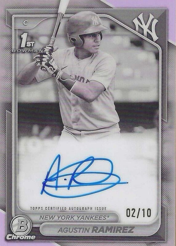 The Agustin Ramirez 2024 Bowman #CPA-AR Chrome Prospect Auto - Pearl Refractor /10 (1st) card in Raw condition has not changed in price in the last 30 days and was last sold for $1,100.00 .