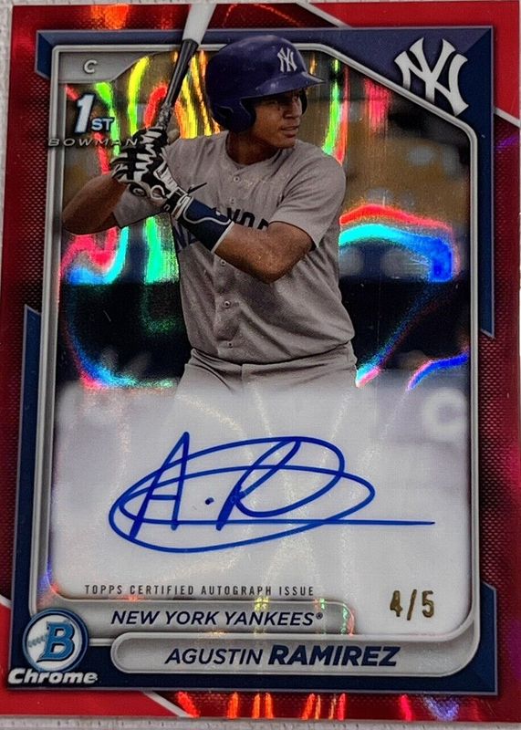 The Agustin Ramirez 2024 Bowman #CPA-AR Chrome Prospect Auto - Red Lava Refractor /5 (1st) card in Raw condition has not changed in price in the last 30 days and was last sold for $1,084.00 .
