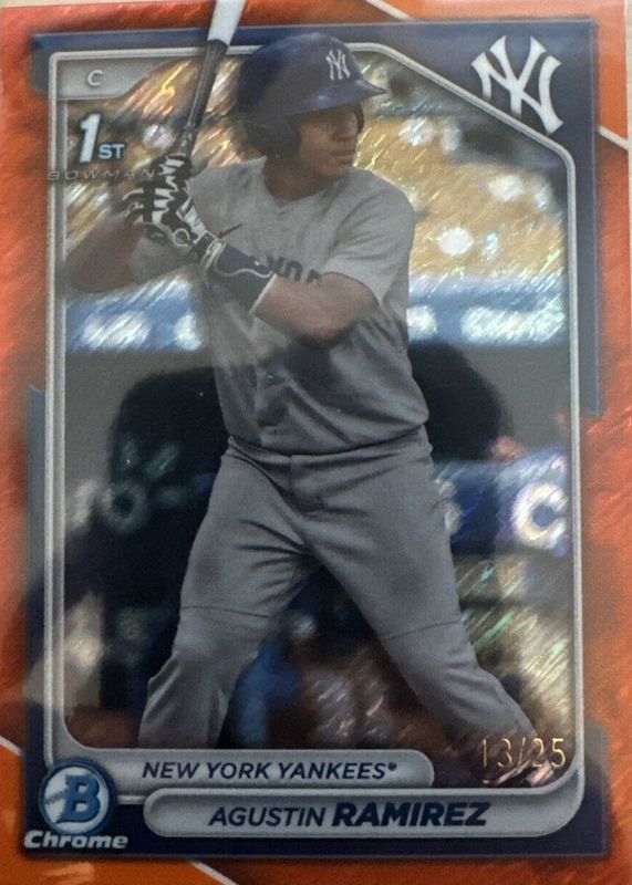 The Agustin Ramirez 2024 Bowman #BCP-85 Chrome Prospects - Orange Shimmer Refractor /25 (1st) card in Raw condition has not changed in price in the last 30 days and was last sold for $38.50 .