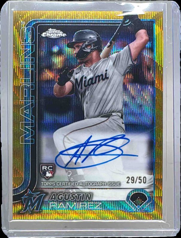 The Agustin Ramirez 2025 Topps Chrome Update #RA-AR Autographs - Gold Wave Refractor /50 Rookie card is 1 of 222 Agustin Ramirez's card variations in the 2025 Topps Chrome Update set being tracked by Sports Card Investor, including #USC38 Base, #USC200 Base, #USC200 Image Variation, #USC38 Rookie Debut, and #USC200 Geometric Refractor.