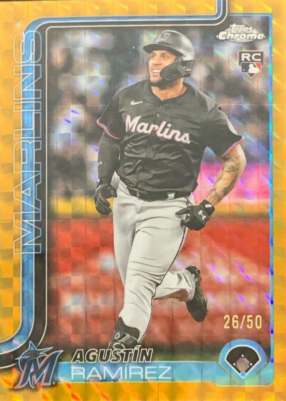 The Agustin Ramirez 2025 Topps Chrome Update #USC200 Gold Geometric Refractor /50 Rookie card in Raw condition has not changed in price in the last 30 days and was last sold for $10.51 .