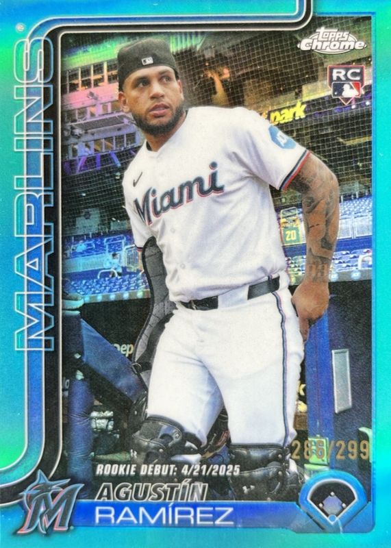 The Agustin Ramirez 2025 Topps Chrome Update #USC38 Rookie Debut - Teal Refractor /299 card in Raw condition has moved up $1.25 (+125%) in the last 30 days and was last sold for $2.25 .