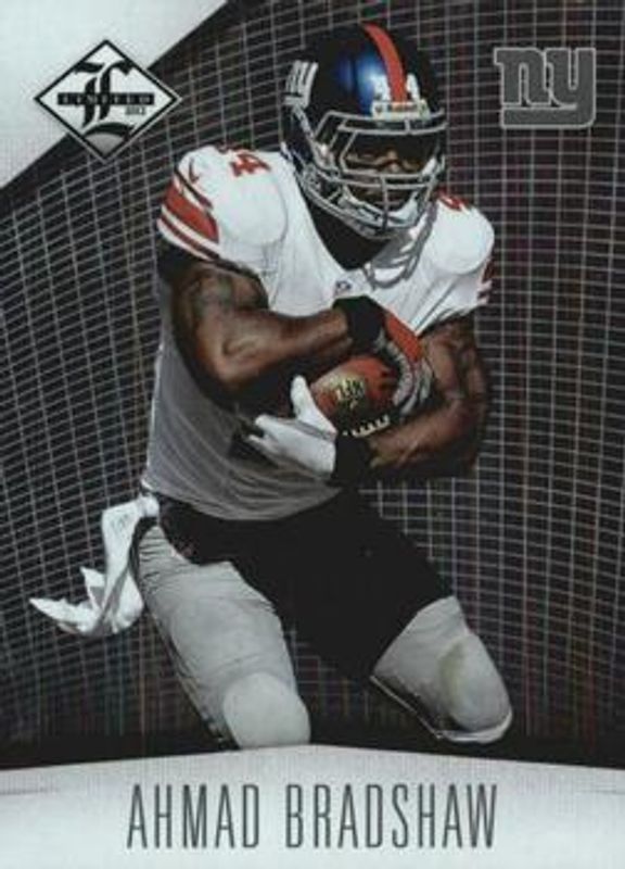 The Ahmad Bradshaw 2012 Limited #64 Base /199 card is 1 of 18 Ahmad Bradshaw's card variations in the 2012 Limited set being tracked by Sports Card Investor, including Silver Spotlight /49, Gold Spotlight /25, Platinum Spotlight /1, Threads /99, and Threads - Prime /49.