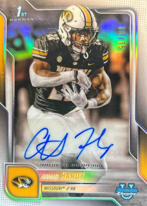 This card is 1 of 18 Ahmad Hardy's card variations in the 2025 Bowman Chrome University set being tracked by Sports Card Investor, including Prospect Auto (1st), Prospect Auto - Stealth Refractor (1st), Prospect Auto - Refractor /299 (1st), Prospect Auto - Blue Mini-Diamond Refractor /150 (1st), and Prospect Auto - Blue Refractor /150 (1st).