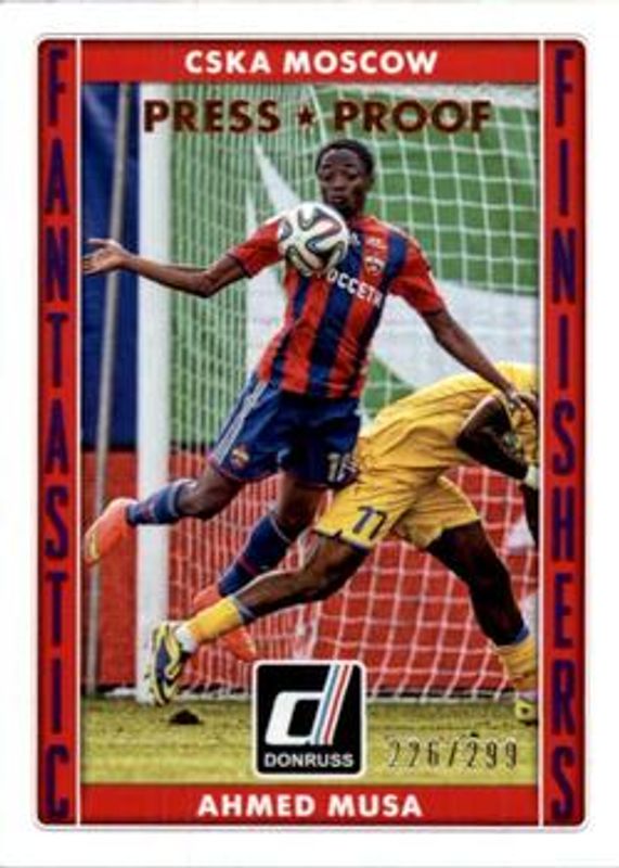 The Ahmed Musa 2015 Donruss #13 Fantastic Finishers Bronze Press Proof /299 card is 1 of 16 Ahmed Musa's card variations in the 2015 Donruss set being tracked by Sports Card Investor, including Base, Bronze Press Proof /299, Silver Press Proof /199, Gold Press Proof /99, and Red Soccer Ball /49.