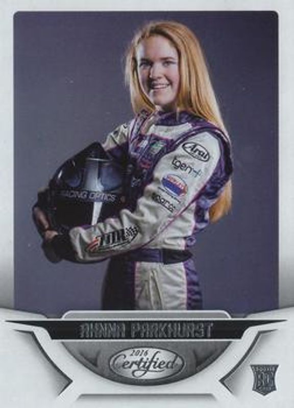 The Ahnna Parkhurst 2016 Certified NASCAR #96 Base /99 card is 1 of 18 Ahnna Parkhurst's card variations in the 2016 Certified NASCAR set being tracked by Sports Card Investor, including Mirror Red /25, Mirror Blue /20, Mirror Gold /15, Mirror Orange /15, and Mirror Silver /15.