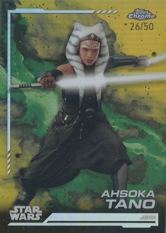 The Ahsoka Tano 2024 Topps Chrome Star Wars #1 Gold Refractor /50 card in Raw condition has not changed in price in the last 30 days and was last sold for $37.99 .