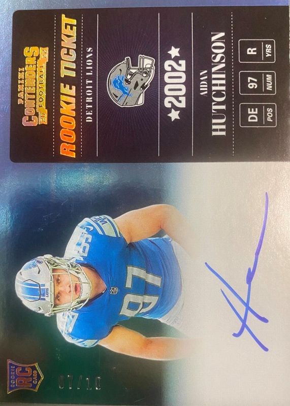 This card is 1 of 32 Aidan Hutchinson's card variations in the 2022 Contenders set being tracked by Sports Card Investor, including Rookie Ticket Auto, Rookie Ticket Auto - Red Zone Ticket, Rookie Ticket Auto - Silver (/49), Rookie Ticket Auto - Ticket Stub (/97), and Rookie Ticket Auto - Wild Card.