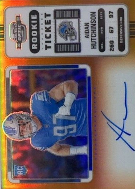 This card is 1 of 45 Aidan Hutchinson's card variations in the 2022 Contenders Optic set being tracked by Sports Card Investor, including Base, Silver, Red /175, Blue /99, and Orange /50.