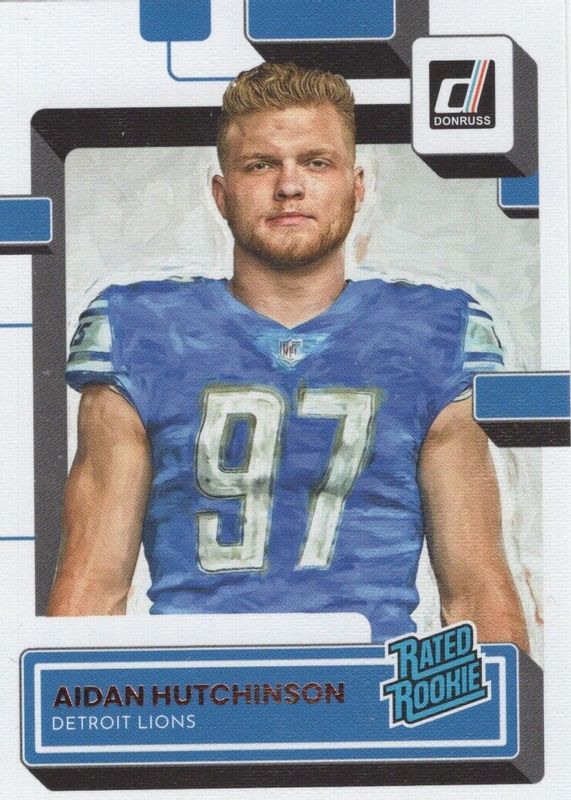 This card is 1 of 43 Aidan Hutchinson's card variations in the 2022 Donruss set being tracked by Sports Card Investor, including Base, Aqueous Test, Jersey Number (/97), No Name, and Optic Preview.